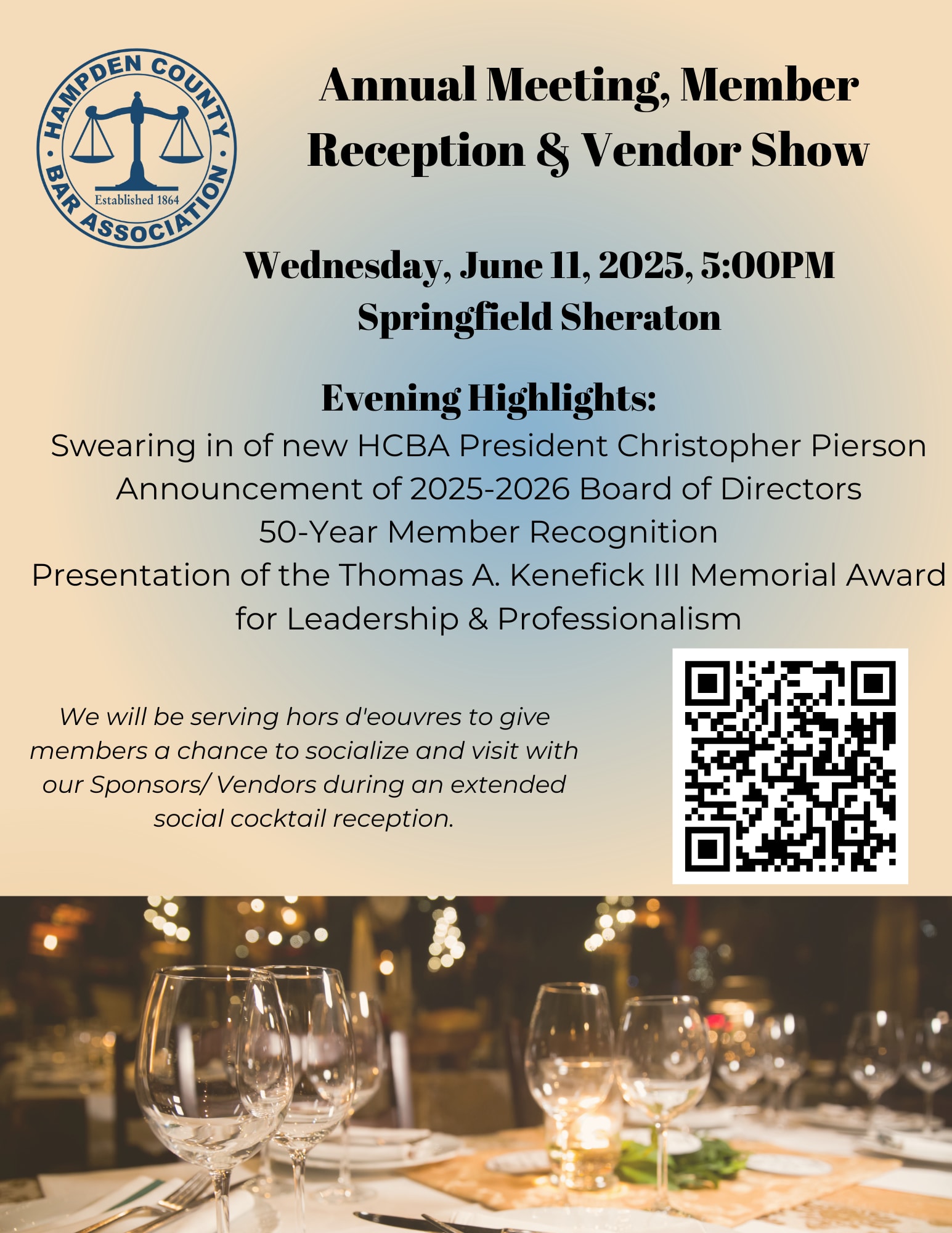 Please join us on Wednesday, June 11, 2025, for our Annual Meeting, Member Reception, and Vendor Show. The event will begin with the Swearing-In of 2025-2026 HCBA President Christopher D. Pierson, Esq., and the announcement of the 2025-2026 HCBA Board of Directors. We will also recognize the bar's fifty-year members and present the first Thomas A. Kenefick III Memorial Award for Leadership & Professionalism. Hors d'oeuvres will be served while members have a chance to socialize and visit with our Sponsors/Vendors during an extended cocktail reception.