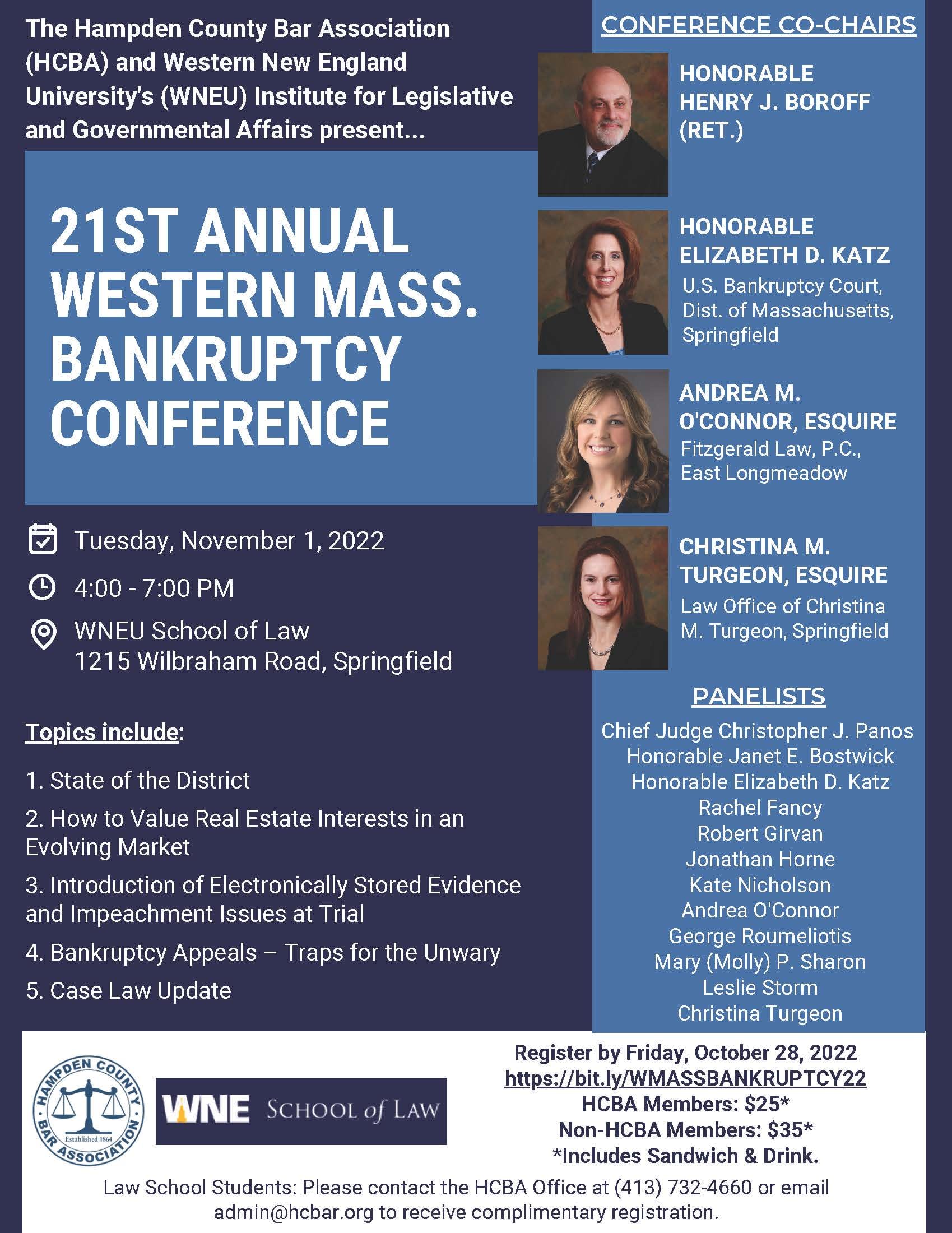 The HCBA and Western New England University's (WNEU) Institute for Legislative and Governmental Affairs will host the 21st Annual Western Massachusetts Bankruptcy Conference on Tuesday, November 1, 2022, from 4:00 - 7:00 pm at WNEU School of Law. Click here for more information on the panelists and topics. HCBA members are encouraged to join the conference for only $25* (non-HCBA members, $35*) and law school students are welcome to attend at no charge.