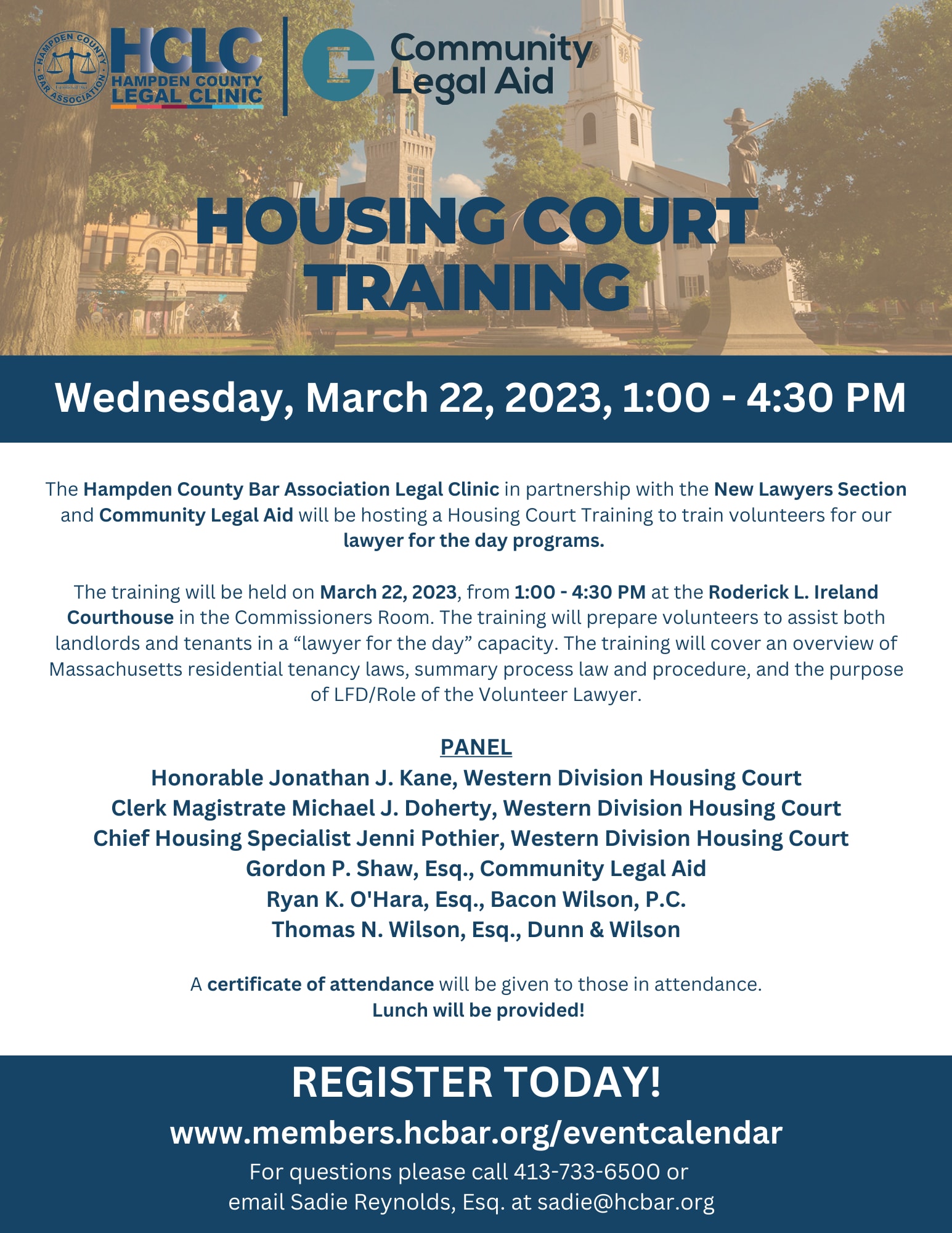 The Hampden County Bar Association Legal Clinic in partnership with the New Lawyers Section and Community Legal Aid will be hosting a Housing Court Training to train volunteers for our lawyer for the day programs.