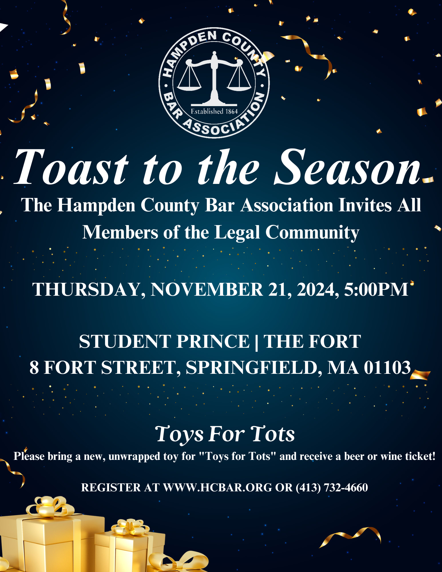 Kick-off the holiday season at the Student Prince Cafe and Fort Restaurant. The Hampden County Bar Association invites all members of the legal community to the "Toast to the Season" Thursday, November 21, 2024, at 5:00 pm. Join us for appetizers, beverages, and fun. And don't forget a new, unwrapped toy for Toys for Tots!